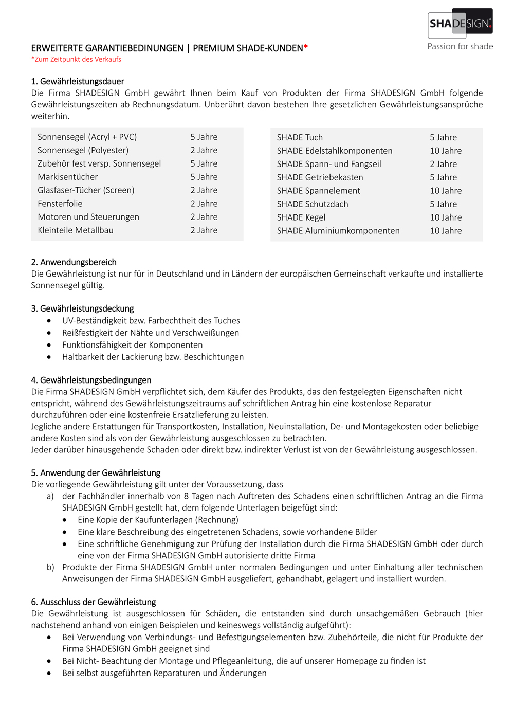 Als ausgewiesener SHADE TOP-PARTNER bieten wir Ihnen eine 5-JAHRES-GARANTIE.